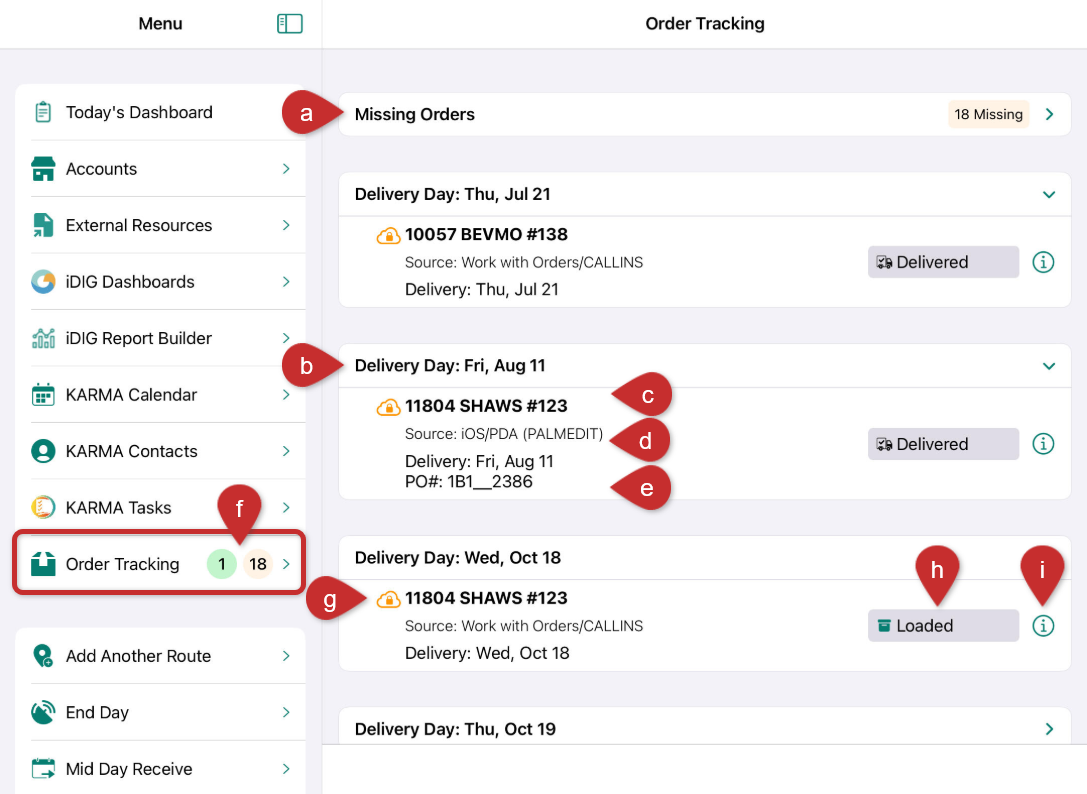 The Order Tracking screen lets you see the open orders for all of your accounts, view and edit order details, and see which accounts still need to place an order for their upcoming delivery day.
